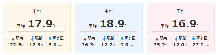 1日の中でも寒暖の差が激しいので、調整できる服装がおすすめ!アウターにはウインドブレーカーや少し厚めの風を通さない上着があると重宝します。