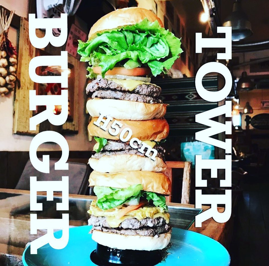 アメリカ食堂の「タワーバーガー」はパティが6枚で約750g!具材とバンズを入れたらなんと1㎏オーバー!!この「タワーバーガー」、大体シェアする方がほとんどだそうですが、たまにひとりでペロリ完食する強者もいるそうですよ。テイクアウトもできるので、ビーチでみんなでシェアして食べても楽しそう!(タワーバーガーをテイクアウトする場合は3分割になります)