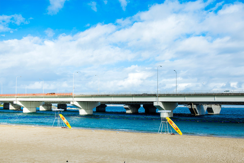 那覇空港まで車で約15分の場所にあるので、「帰る前にもうひと泳ぎしたい」というときに立ち寄れるタウン派ビーチ。更衣室・ロッカーなどの設備が整い、泳いだあとにそのまま街へと出かけることもできて便利。