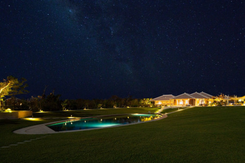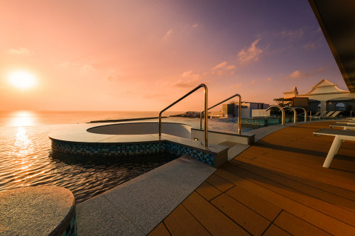 ライトアップされる日没後は、ナイトプールとしても楽しめる