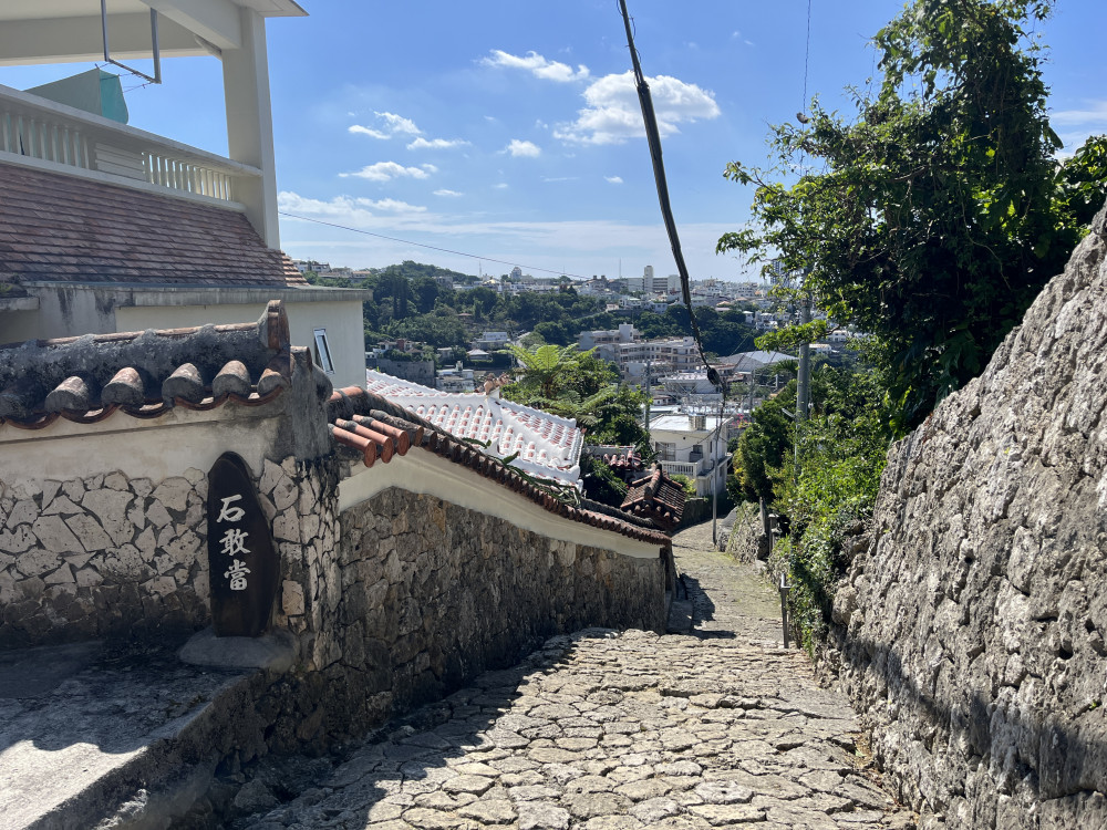 首里金城町の石畳道は、16世紀に首里から那覇港や沖縄本島南部へ通じる主要道路として造られた「真珠道(まだまみち)」の一部。敷石は琉球石灰岩を組み合わせて作られており、当時は総延長約10kmにも及んだ道でしたが、現在では約300mで石畳道がみられます。周辺には赤瓦家が並び、琉球王国時代の城下町の風情を感じることができるので、ぜひ散策を楽しんでくださいね。
