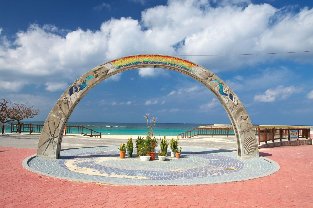 沖縄本島、中部の西海岸沿いにあるアメリカンな雰囲気が漂うロングビーチ。外国人客が多く、バスケットコートや大型船の遊具があるので子どもたちにも人気があります。更衣室やシャワールームのほか、バナナボートやグラスボートなどのマリンアクティビティも充実。遊泳エリアにはハブクラゲネットが設置されています。近くにはレストランや商業施設が数多くあり、人気の観光スポット「美浜アメリカンビレッジ」もすぐそこ。海沿いの遊歩道をのんびり歩いていくと、約15〜20分で到着します。
