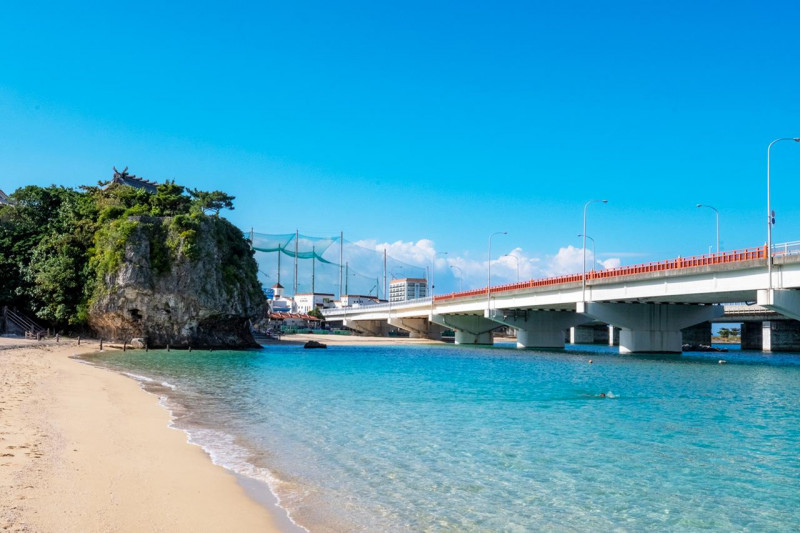 那覇市内にある唯一の遊泳ビーチ。周辺は那覇市民の憩いの公園でもあり、更衣室、シャワー、トイレ、コインロッカーが完備、遊泳期間の4〜10月にはライフガードも常駐しているので、安心して海遊びができます。サンセットスポットとしても人気があるので、1日目の夕陽を眺めるのも良いかも。