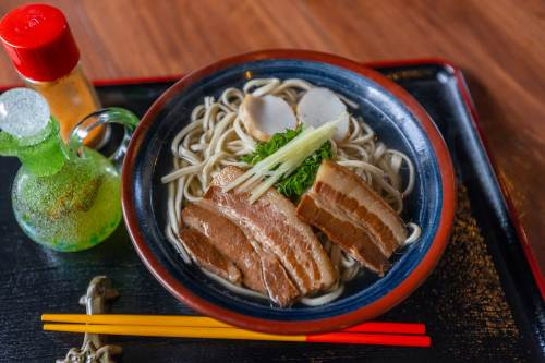 甘いものの箸休めは、やはり沖縄そば。首里城公園の守礼門近くに2021年にオープンした「首里そば なかだ」は、首里の名店「首里そば」の姉妹店。本店よりも少し柔らかめの麺が特徴で、丁寧につくられたスープの美味しさも相まって、ペロリと食べてしまいます。