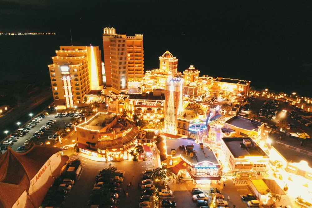 那覇市内からバスで約40分の北谷町、美浜アメリカンビレッジは、おもちゃ箱をひっくり返したような賑やかなリゾートタウン。アメリカ西海岸のような雰囲気の海沿いにカフェやレストラン、リゾートホテルのあるショッピングエリアが広がり、ビーチや映画館、温泉施設まで揃っているので、朝から夜まで1日中楽しむことができます。