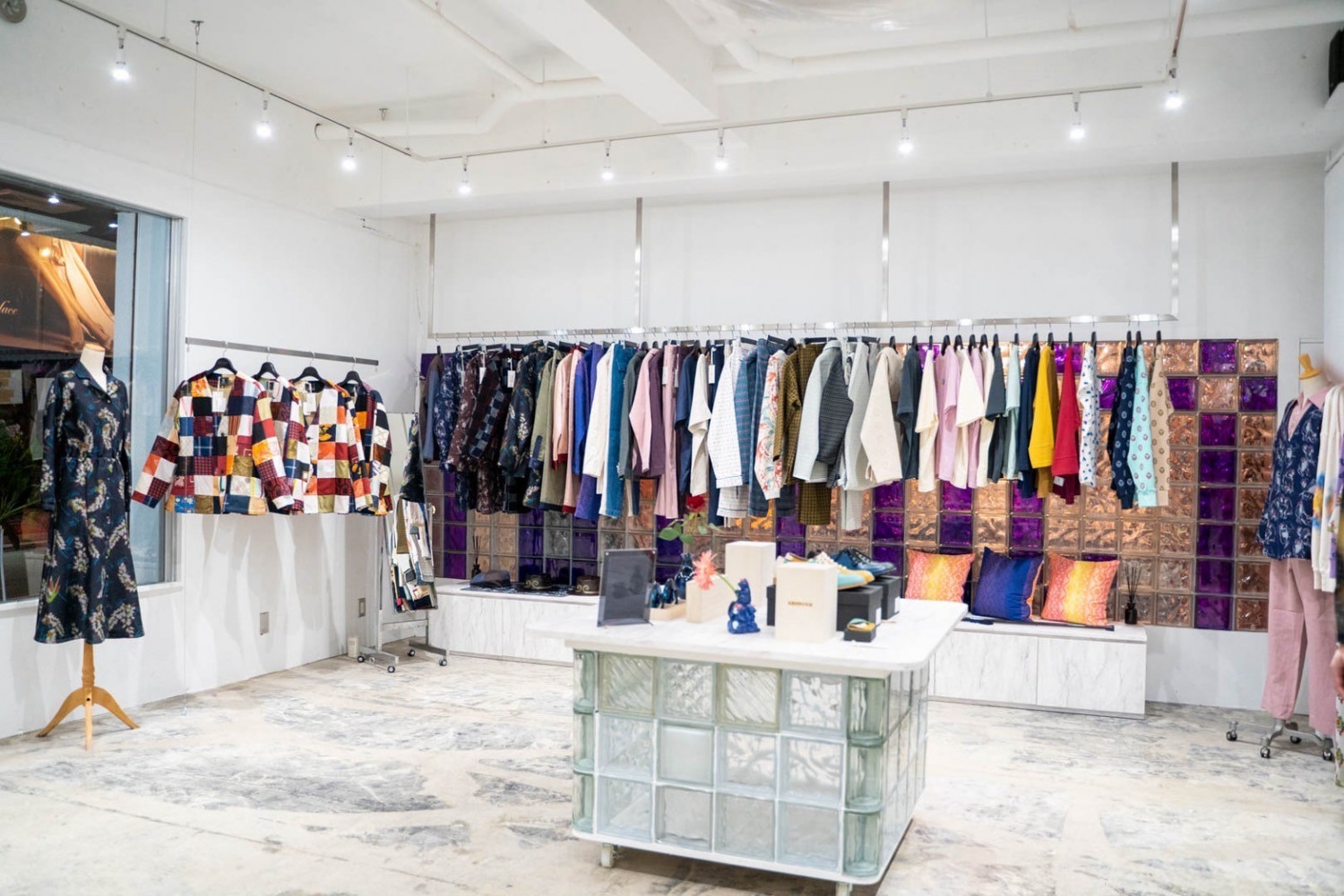 店内は、TUITACI ブランドアイテムに加え、ディレクターズセレクトとして、ヴィンテージアイテムや一部セレクト商品 が ラインナップされます。今回オープン記念アイテムとして、着物用の古布をアップサイクルしパッチワークしたリメイクのノーカラージャケットと、琉球ガラス職人の友利龍氏作の徳利と盃を限定にて販売いたします。