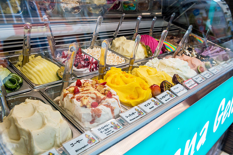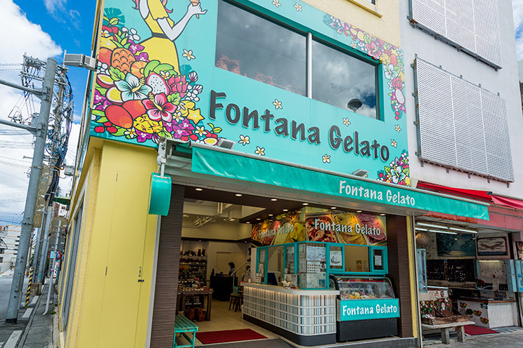 国際通りの交差点でひときわ目を引くアクアマリンの外装が目印で、カラフルなジェラートに通行人が足を止める人気店。こちらのお店のフレッシュなジェラートは、契約農家から仕入れたグァバやマンゴー、紅芋などの県産素材を使って作られており、人気のレインボーミルクやグァバなどの定番の味わいや旬素材を使った期間限定メニューが楽しめます。