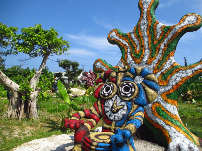 広大な敷地には、巨大なシーサーピラミッドをはじめ、個性派シーサーやギョッギョッとする衝撃のオブジェ群など、さまざまなシーサーが立ち並んでいます。熱帯果樹や池、小川など、大自然と調和したシーサーたちは必見ですよ。一角には米子焼工房があり、工房内は見学自由!自由奔放な創作シーサーを中心に展示販売もおこなっています。