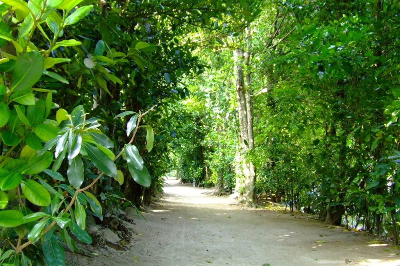 まるでフクギのトンネルのような神秘的な空間がひろがっているこちらのスポット。海洋博公園近くの備瀬地区、碁盤の目のように区画した村落で、約250戸ある住宅のほとんどは繁茂したフクギの屋敷林に囲まれています。数千本に及ぶとみられる備瀬のフクギのなかで、もっとも古いものは推定樹齢300年といわれており、濃い緑の葉の間から差し込む柔らかな陽光が、訪れる人々の心を穏やかに癒してくれます。