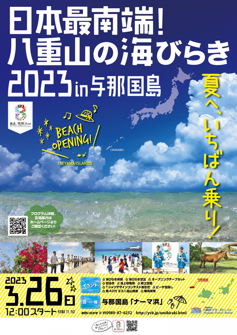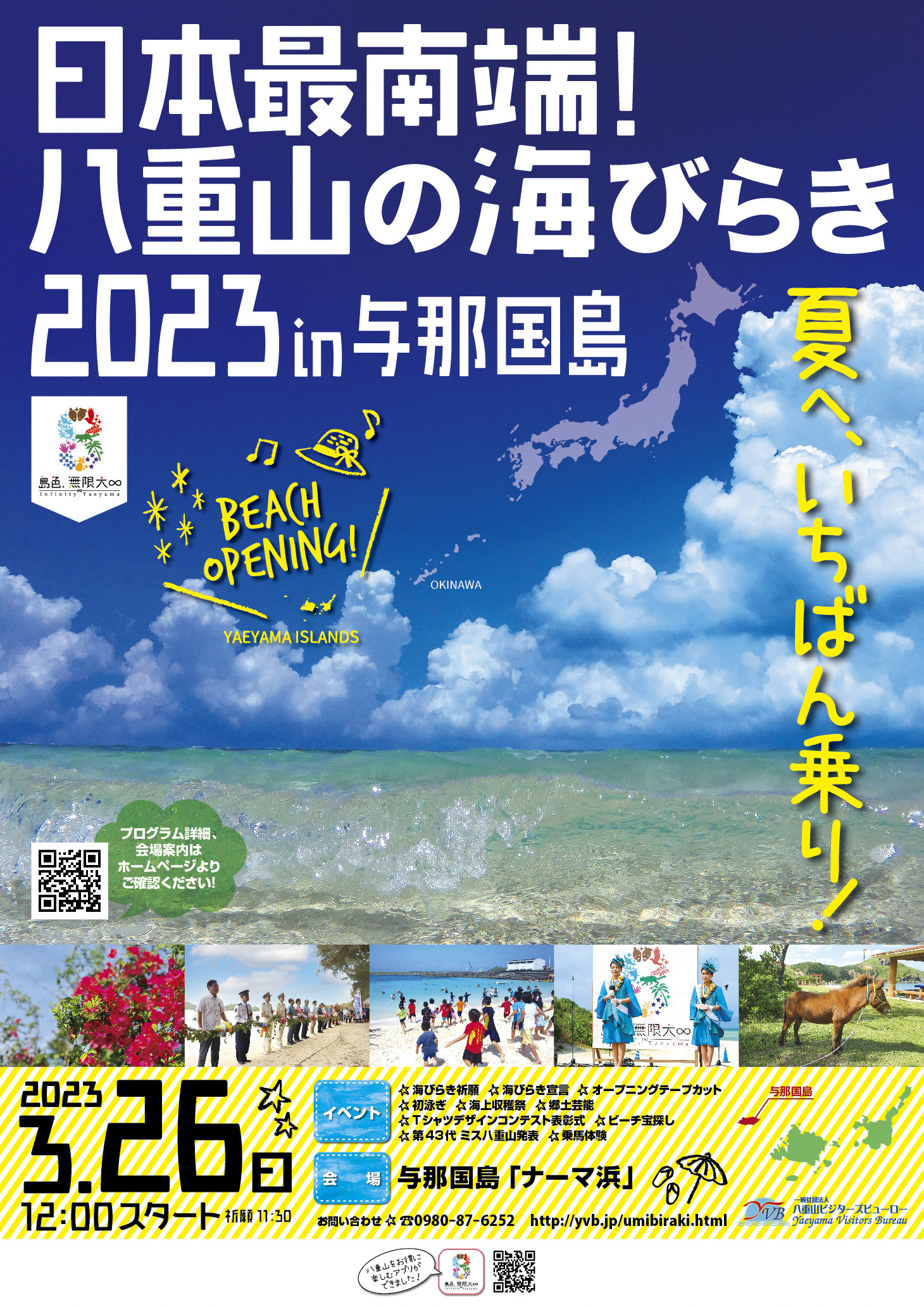 ひと足早い夏の訪れを日本全国にアピール!イベント当日は、10時から祈願、オープニング同10時半開始。プログラムは、海びらき宣言、オープニングテープカット、郷土芸能、ビオレUV日焼け止め贈呈式、Tシャツデザインコンテスト表彰式、第44代ミス八重山発表、ミニライブなどを開催予定。ビーチサイドの部では、宝探しゲームや海上に浮かばせた果物などを集める「海上収穫祭」、セーリング体験も予定しています!