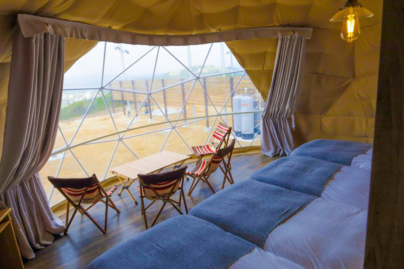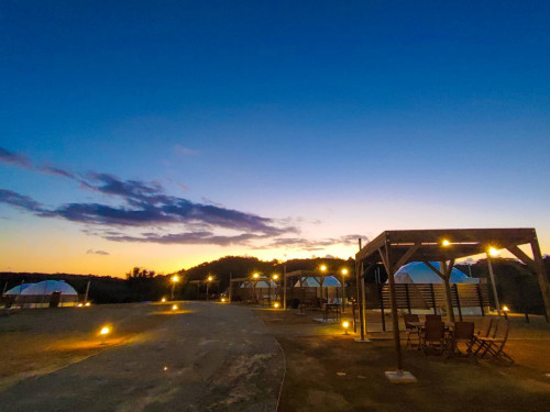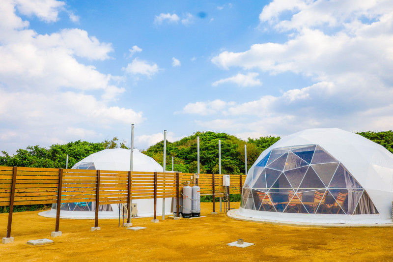 今年2月に南城市にオープンした県内最大級の「エイトポイントリゾート沖縄」。高台に位置しており、視界を遮るものがないので一面パノラマビューの絶景を独り占めできますよ。宿泊するドーム型テントにはそれぞれ専用のBBQスペースと駐車場が付いているので、プライベート感も満載です。