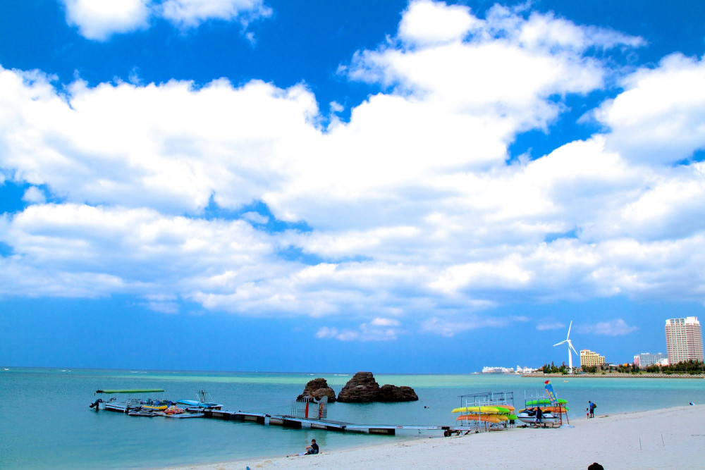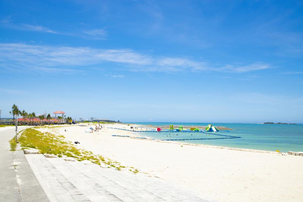 豊見城市にある県内最大級のビーチです。海水浴シーズン中には、マリンアスレチックも楽しむことができます。美しいヤシ並木の先に広がる700mの白砂浜は、どなたでも安全かつ快適に利用できる環境が整っています。近くにあるオリオンビール園なども楽しめるので、海水浴だけでなく、さまざまなアクティビティも楽しめるビーチです。