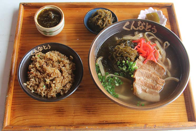海を眺めながら食事を楽しめるテラス席のある”くんなとぅ”の沖縄そばは、モズクを練りこんだツルツルの麺が特徴で、コクがありながらもすっきりとした味わいのスープが相性抜群です。生もずくを加えることで、忘れられない味わいと食感を楽しめす。また、オーガニックもずくをお代わり自由で堪能できるので、もずく好きには必見です。