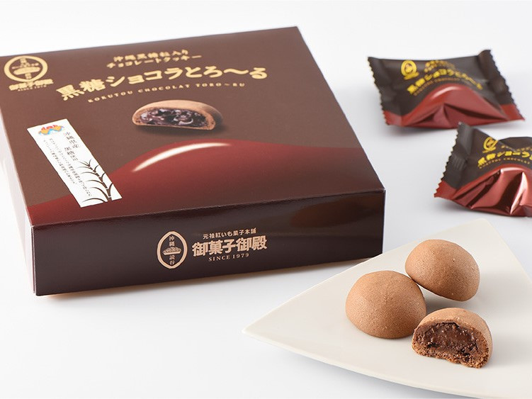 沖縄県産の黒糖と、黒蜜を練りこんだクッキー生地にチョコレートと粒状の黒糖を包んだ焼き菓子「黒糖ショコラとろ~る」。サックサクのクッキーでとろとろのチョコレート黒糖を包んでおり、一口かじるとチョコレート黒糖が口に広がる絶品スイーツです。