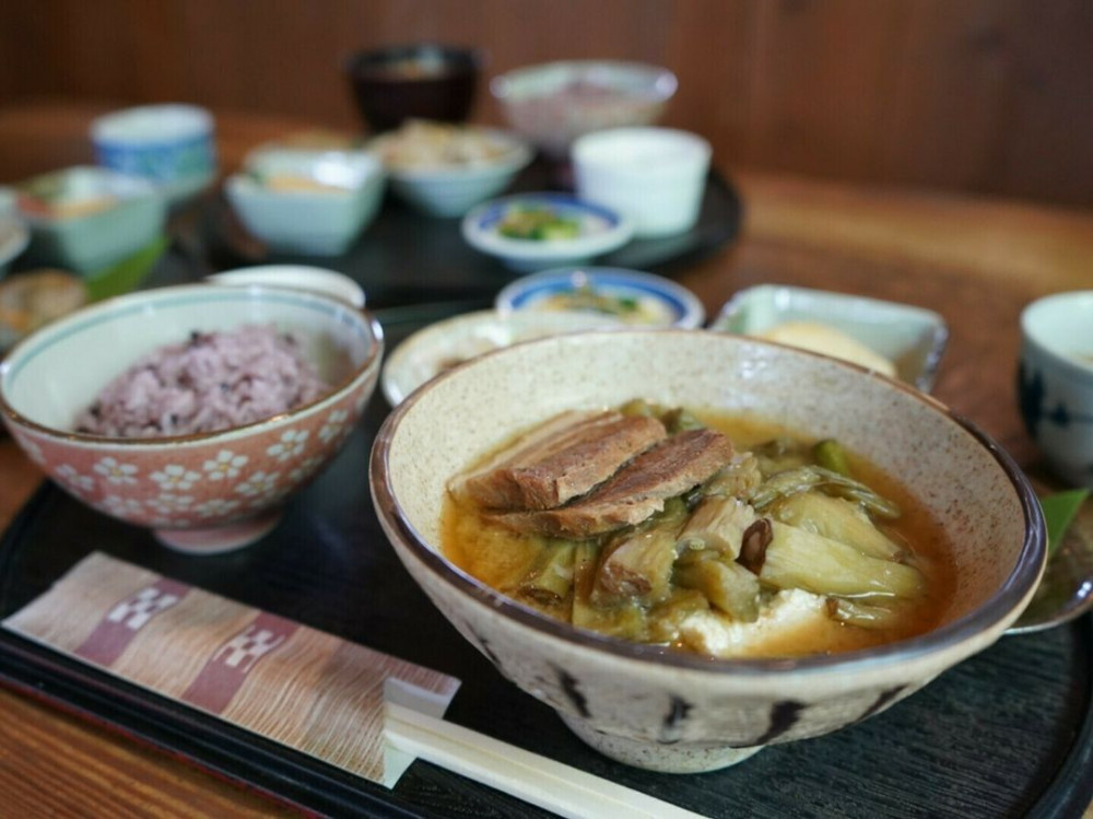 首里地区の閑静な住宅街にある創業30年以上の老舗「富久屋」。昔ながらの沖縄雰囲気にあふれる店内で、沖縄県民がお祝いの際によく食べられる「中身汁」や「いなむどぅち」の定食、定番の「沖縄そば」など、沖縄の伝統的な郷土料理を味わえます。