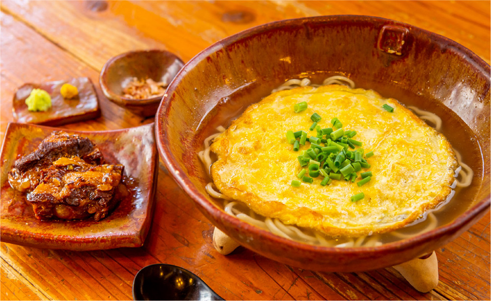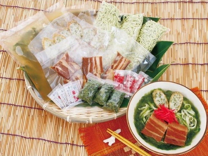 沖縄のテレビ局による沖縄そば人気投票で初代沖縄そば王となった名店「いしぐふー」。こちらのお店の看板メニューは「炙りソーキそば」!いしぐふー発祥の炙りソーキと試作を重ねたモチモチ食感の麺が絶品なんですよ。麺の上にのった卵焼きは、卵のヒラヤーチー(平焼き)がのっていた昔の沖縄そばをアレンジしたものなんだとか。各店舗で頂くのはもちろん、発送して自宅で頂くことも可能です。