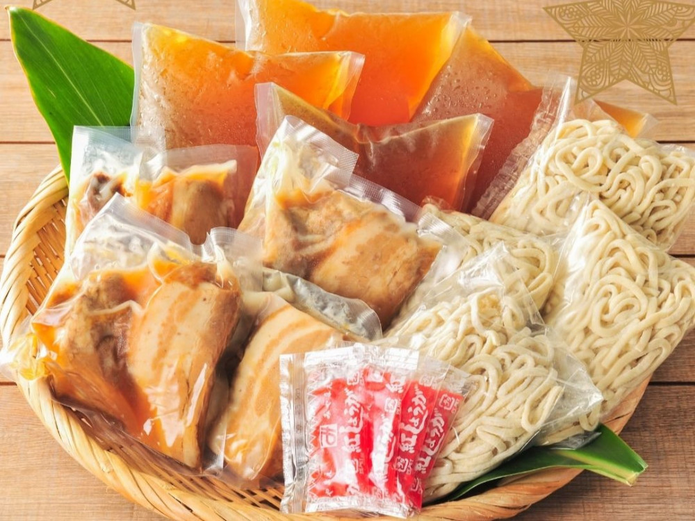 自家製生麺とスープ、お肉3種がパウチされたセットをお取り寄せできますよ。