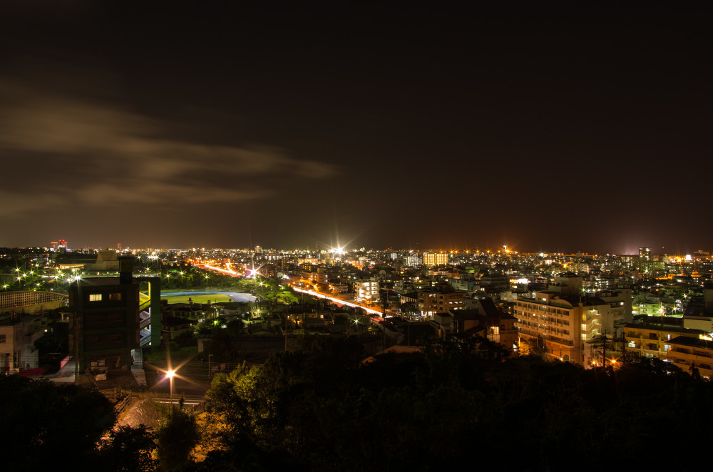 浦添市と宜野湾市に隣接した場所に位置する「浦添大公園展望台」からは、車通りの多い浦添バイパスが特徴の夜景を一望できます。家族連れで賑わう日中とは異なり、夜になると地元のカップルなどが多く訪れます。沖縄らしい雰囲気を感じながら、綺麗に輝く市街の明かりをぜひ堪能してみてはいかがでしょうか。