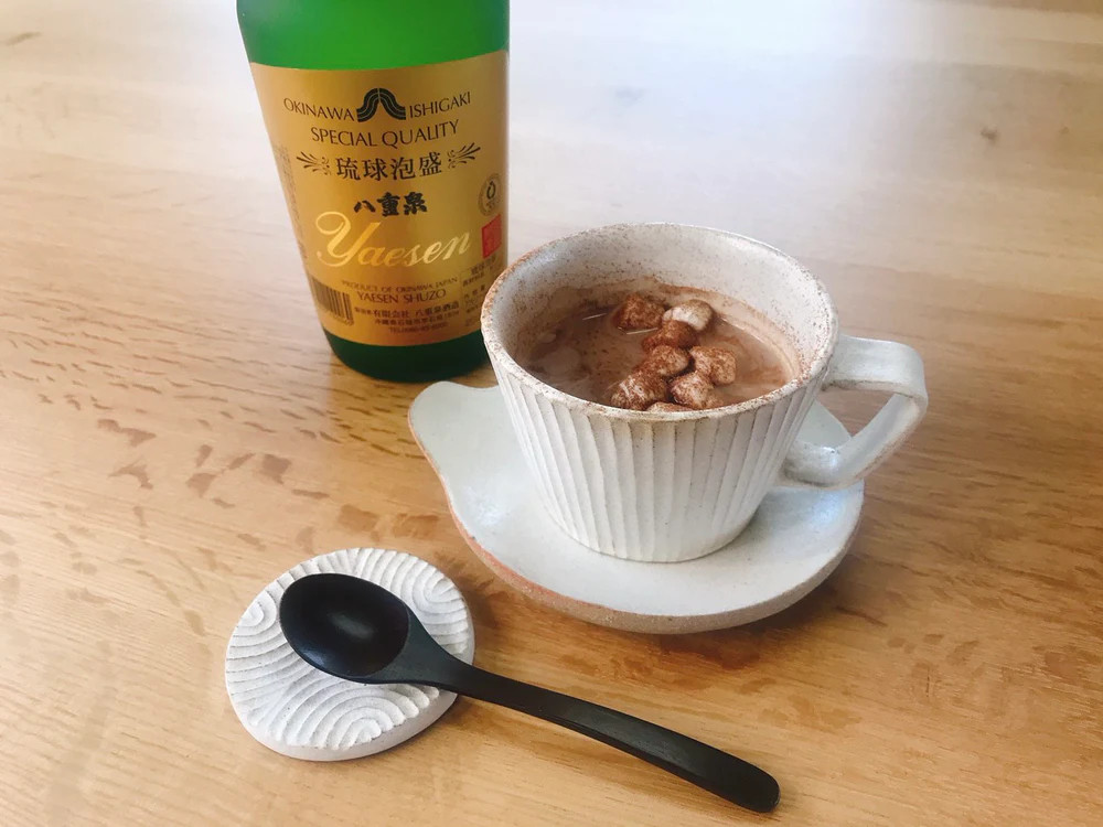 グリーンボトルの愛称で島の人々に親しまれている「八重泉樽貯蔵」。直火蒸留の原酒を樫樽で貯蔵熟成した泡盛で、樽香と泡盛香がバランスよく香るのが特徴です。まだまだ夜間は肌寒いこの時期には、泡盛とホットチョコと合わせたこんなホットドリンクもおすすめですよ。