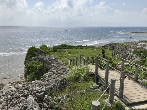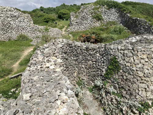 具志川城跡は、沖縄本島南端の喜屋武岬(きゃんみさき)の西海岸に突き出た断崖に築かれた城で、城門の東側以外三方が海に面しています。城壁は高さが5~10mあり、陸続きの東側の城門は切石積みで、さらに崖を沿って野面積みの石垣がめぐらされています。城内には地元で「ヒーフチミー」と呼ばれる海に通じる穴があります。
