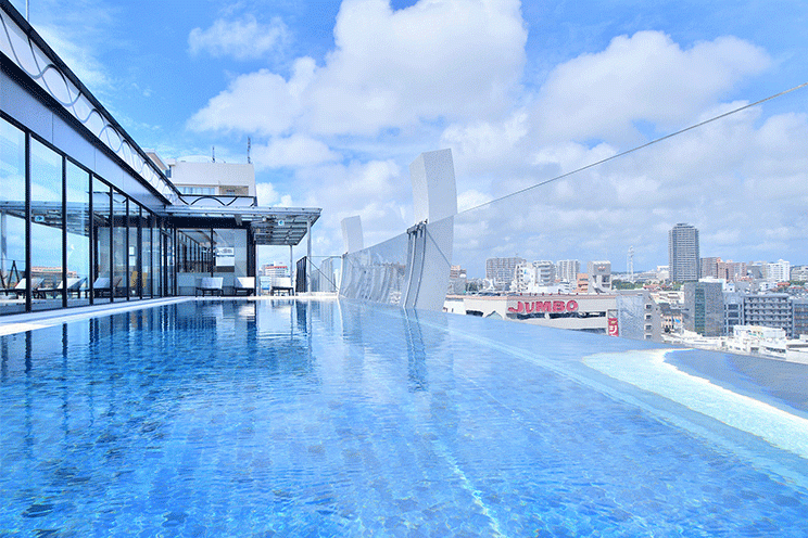 最上階にシースループール&ルーフトップバーを備えたシティリゾート。泊ふ頭ターミナル(とまりん)まで徒歩30秒で離島へのアクセスも抜群。