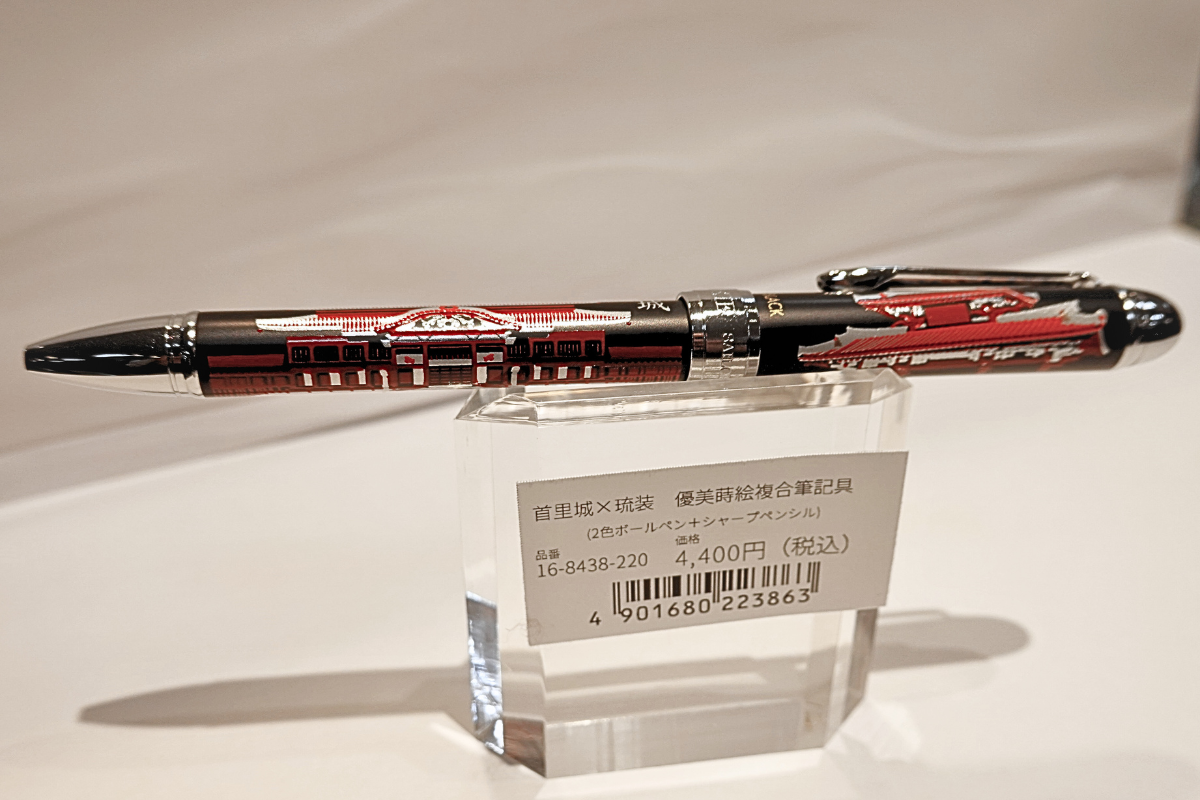 セーラー万年筆さんから販売された首里城デザインの「多機能ペン(2色ボールペン+シャープペン)」。首里城は惜しくも2019年に正殿が焼失してしまいましたが、2026年の完成を目指し、現在も復元に向けた作業が行われています。沖縄県民とともに復興に向けて、首里城モチーフのアイテムを普段使いしてみませんか?