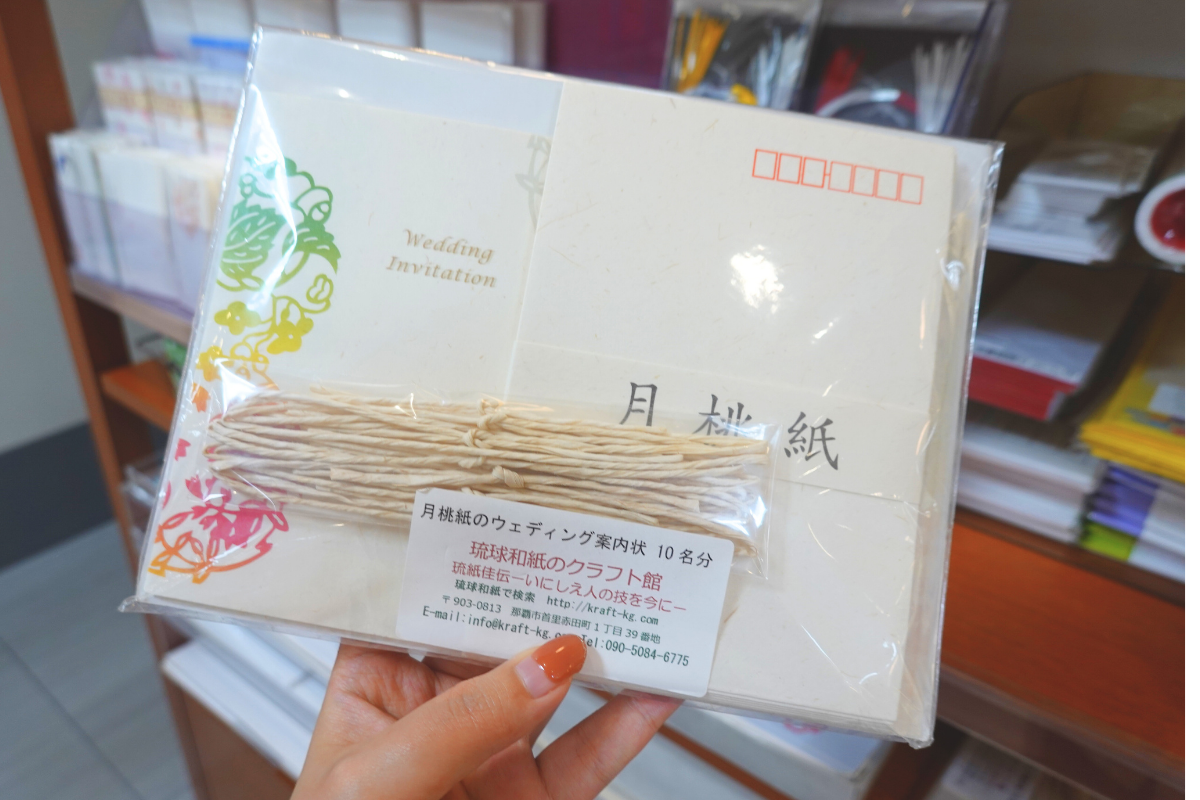 月桃(げっとう)とは、沖縄で馴染み深いショウガ科の植物。その月桃の茎(繊維)から作られたものが”月桃紙”です。月桃紙は、やわらかな風合いが特徴で、沖縄家庭の障子紙や壁紙にも使われているんです。そんな温かみのある月桃紙で出来たレターセットや招待カードなどはお土産にもぴったり!