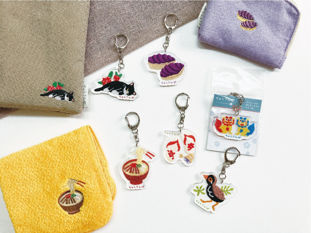 沖縄らしいキュートなグッズを取り扱っている雑貨ブランド「ちゅらさんぽ」では、大切な誰かとお揃いで持ちたくなる、おきなわモチーフが刺繍されたキーホルダーを販売しています。ヤンバルクイナや紅芋タルトの刺繍を閉じ込めたキーホルダーは、光にきらきら反射する透明感と、やさしい刺繍の風合いがポイント!沖縄旅行を終えても、目に入る度に沖縄の景色がきっとよみがえりますよ。