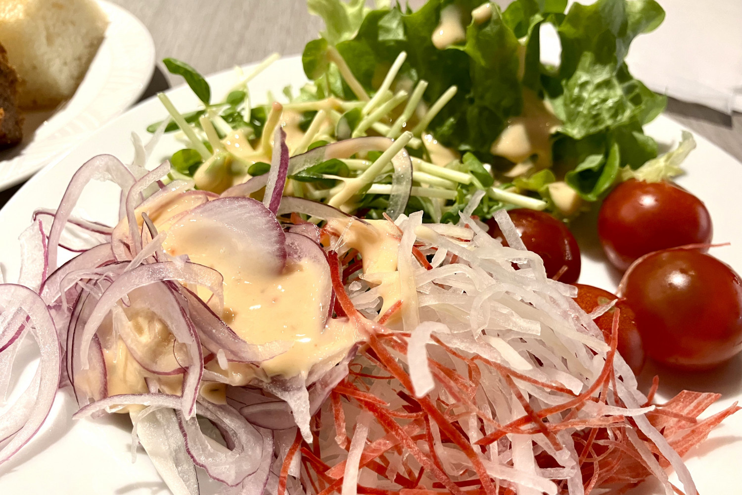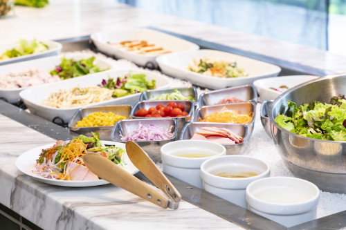 ※ハーフブッフェとは、メインの料理はオーダーしたものを席に持ってきてくれ、前菜・サラダ・デザート・ドリンク等はブッフェ台から好きにとって食べることができるスタイルのことを言います。
