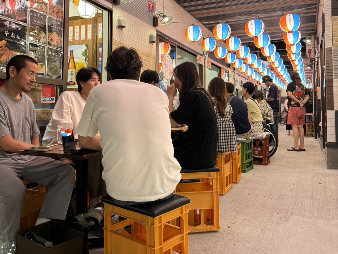 場所が少し分かりにくい所にあり、「探して楽しむ屋台村」ともいわれていますが、細い地道を抜けた場所に提灯が広がる屋台村は、