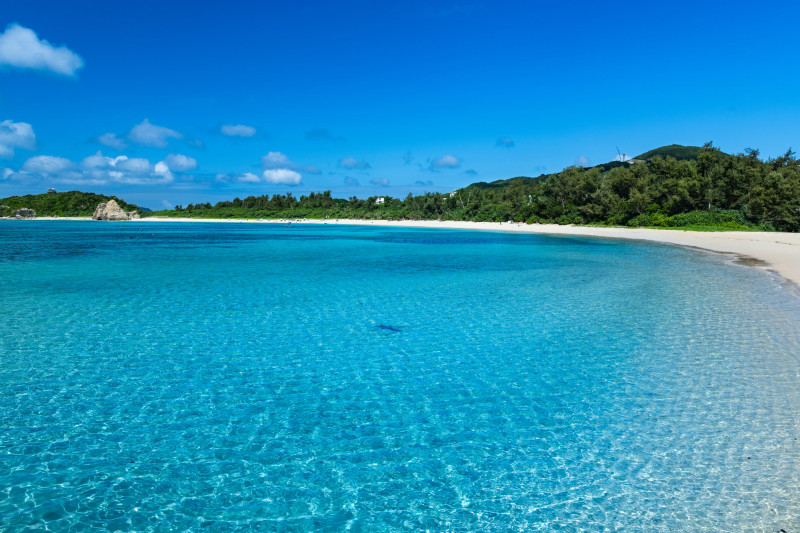久米島は、かつての琉球王朝時代、琉球の島々の中でもっとも美しい「球美の島(くみのしま)」と讃えられた島して知られています。島のほぼ全体が県立自然公園に指定されており、約7㎞にも及ぶ真っ白な砂浜とエメラルドグリーンの海のコントラストが見事な「ハテの浜」や、亀の甲羅のような奇岩群が砂浜に一面に広がる「畳石」など、久米島ならではの景色も魅力です。海洋深層水を活用した車エビや海ぶどうの養殖も盛んなので、ゆったりと綺麗な景観を楽しみながらグルメも楽しみたい方にぴったりですよ。