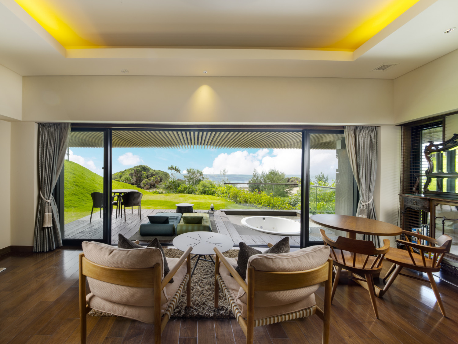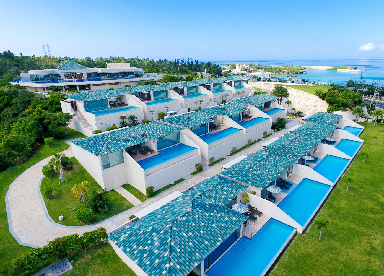 海抜30mほどの小高い丘から真っ青な東シナ海を見下ろすコテージタイプスイートルームが全14棟。