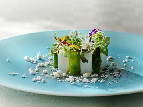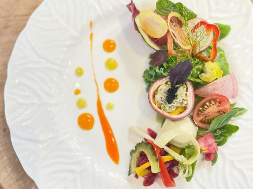 皿の上の自然のお料理は、シェフのこれまでの料理経験とヨーロッパなどを巡った際の旅先で生まれたインスピレーションからなるもの。
