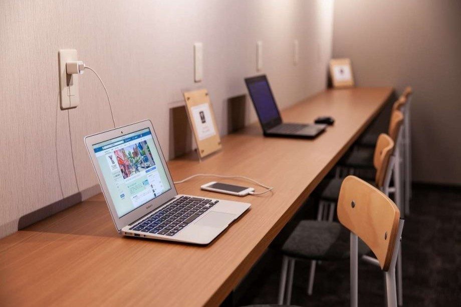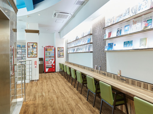 1階にはカフェスタイルのおしゃれなラウンジが広がっており、食事や仕事のスペースとして利用できます。2階には、宿泊客なら誰でも利用可能な畳敷きのラウンジがあり、漫画や沖縄観光ブックなども揃っています。また、ロビーにはコンセントが設置されたPCカウンターもあり、PCでの仕事も可能です。