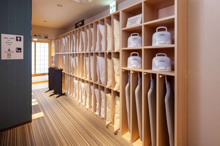 大浴場のそばにはコインランドリーも設置されており、洗濯から乾燥まで可能です。そのため、少ない荷物で沖縄旅行を楽しむことができます!2階にあるレンタルコーナーには枕が並んでおり、お好みの枕を選ぶことができます。さらに、スチームアイロンやズボンプレッサーも無料でレンタル可能です。