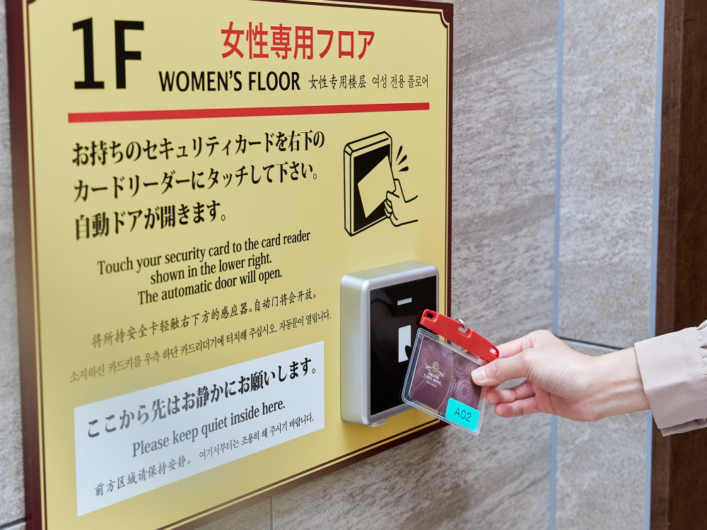 自分の部屋のようにゆっくりと過ごせる空間が広がる完全個室の客室には施錠可能なアコーディオンカーテンがあり、セキュリティ万全です。ベッドの下にはスーツケースを置くスペースもあるため、快適にお部屋を利用できます。また、客室フロアは男性エリアと女性エリアで分かれており、フロアに入る際はセキュリティカードが必要なため、女性でも安心して過ごすことができます。