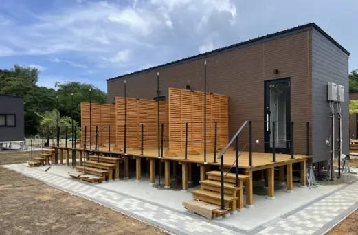 屋外占有スペースにウッドデッキを取り入れ、「アウトドアリビング」という発想で活用できます。清潔感のある室内と、キャンプ的な要素を楽しめる屋外を組み合わせたユニークな客室設計となっており、客室の閉塞感を感じないように、「アウトドアリビング」に面した部分は、ガラスの引き戸にし、屋内と屋外の一体感をライトキャンプ間隔で演出。ご家族やカップルでもご利用いただけます。