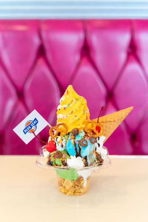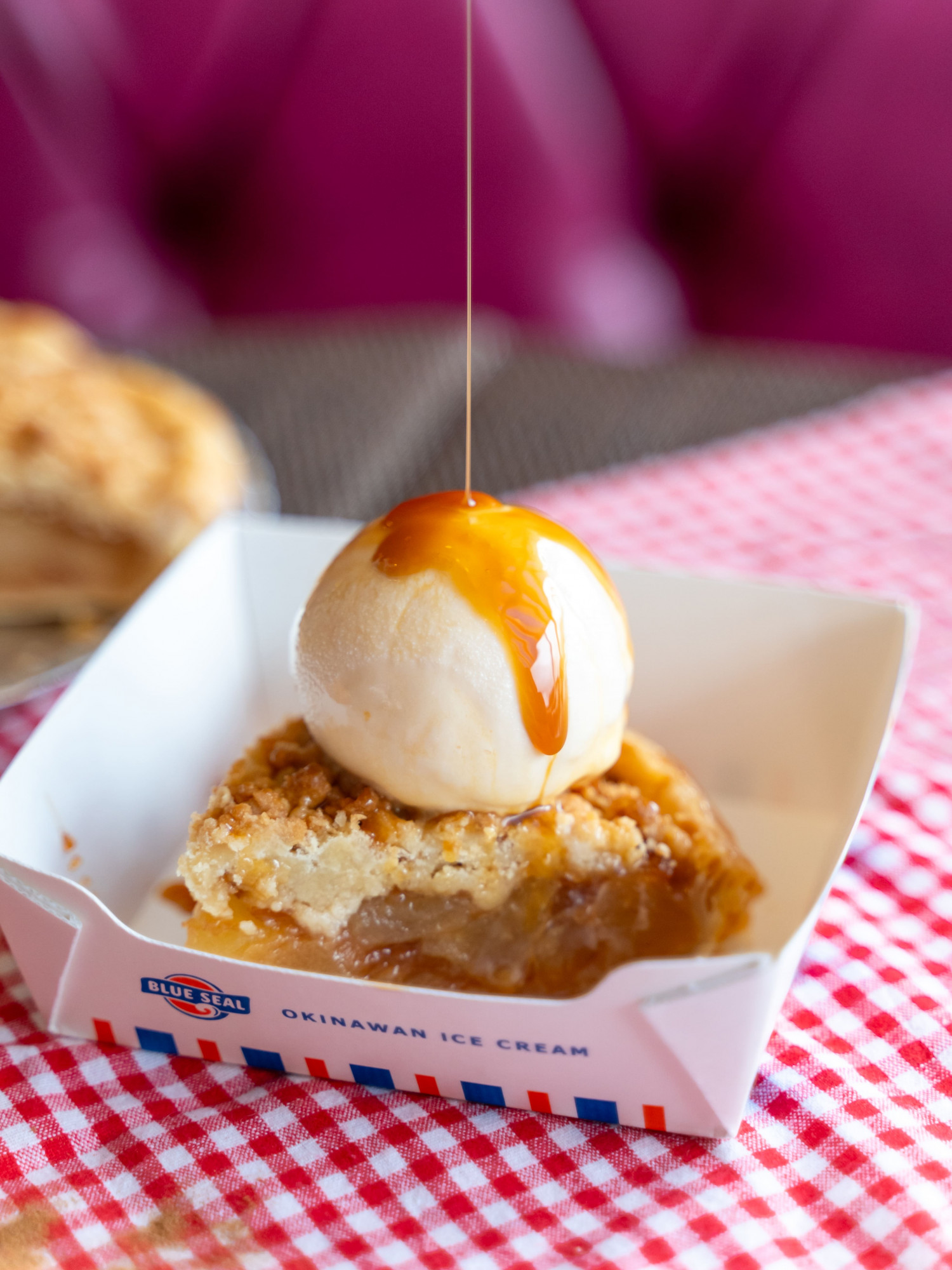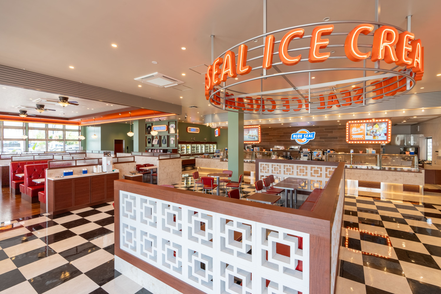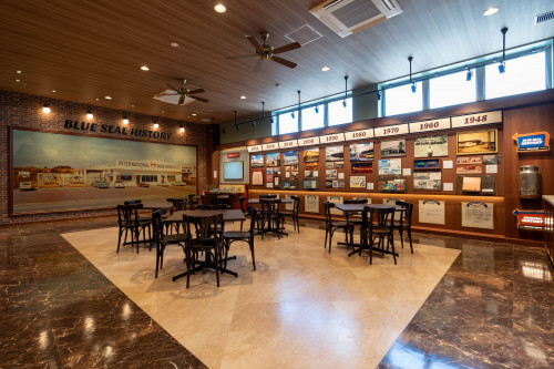 "笑顔の思い出シアター"をコンセプトに、2階建てとなった「ブルーシール 牧港本店」。1階は、“アメリカンダイナー”の雰囲気や、花ブロックや琉球石灰岩模様のパネルといった新たな“沖縄”の要素を取り入れた雰囲気を楽しめます。2階には、1948年の創業からの歴史を振り返ることができるヒストリーコーナーや、マネキンのジョニーさん(愛称)と写真撮影ができるカウンターがあります。さらに、新設されたドライブスルーでは、ドライブの途中にブルーシールアイスを手軽に楽しむことができます。牧港限定の「パーティーサンデー」や、バニラアイスと相性抜群の「カリフォルニア アップルパイアラモード」など、特別なデザートも揃っています♪浦添市に訪れた際は、ぜひブルーシールで特別なひとときをお過ごしください。