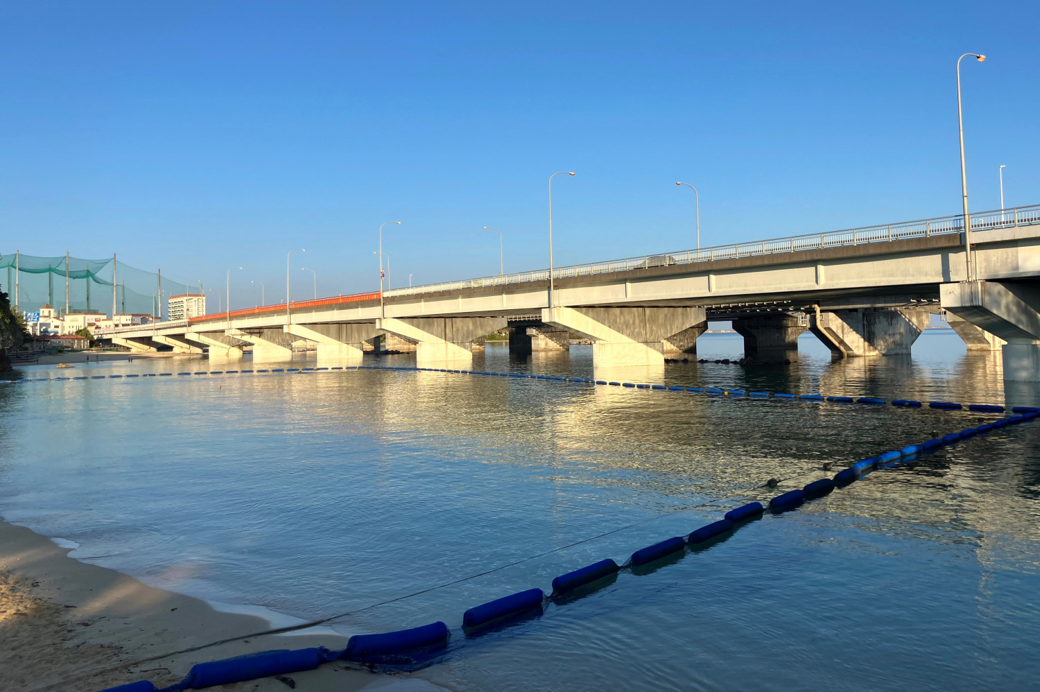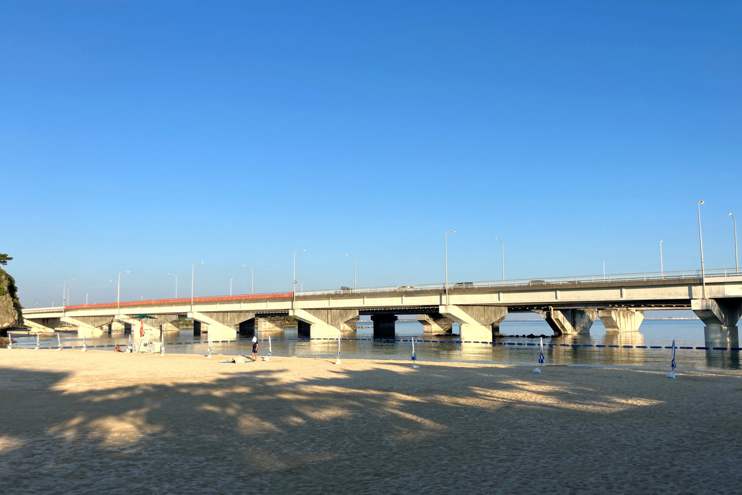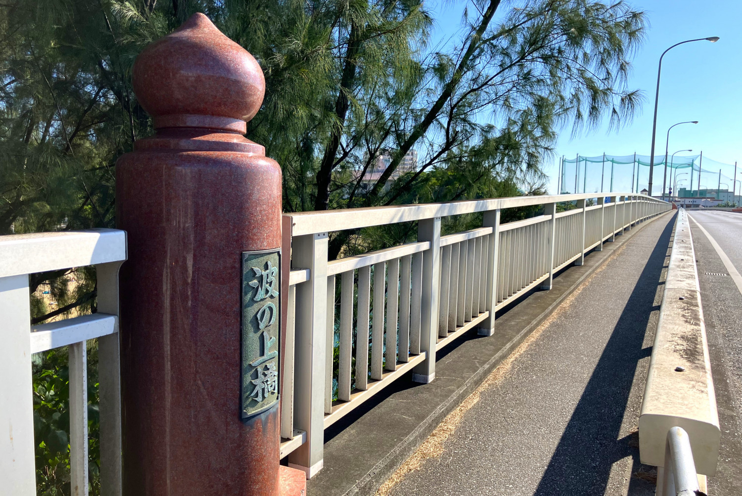 橋の下にある波の上ビーチから橋をみるとこのような景色です。波上宮の前にあたる部分の欄干は赤く塗られ、擬宝珠で飾られています。