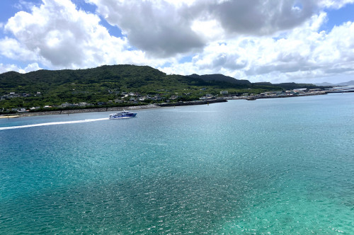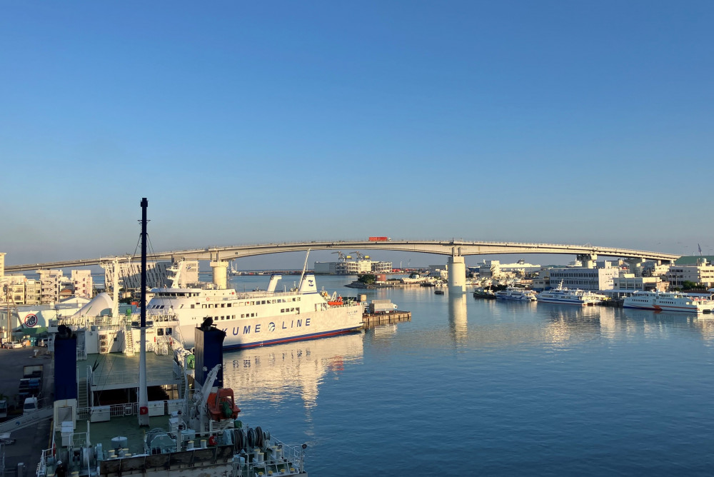 橋の上からは絶景がひろがります。那覇泊港行きの高速船・ジンベエマリンが通っていくのが見えます。