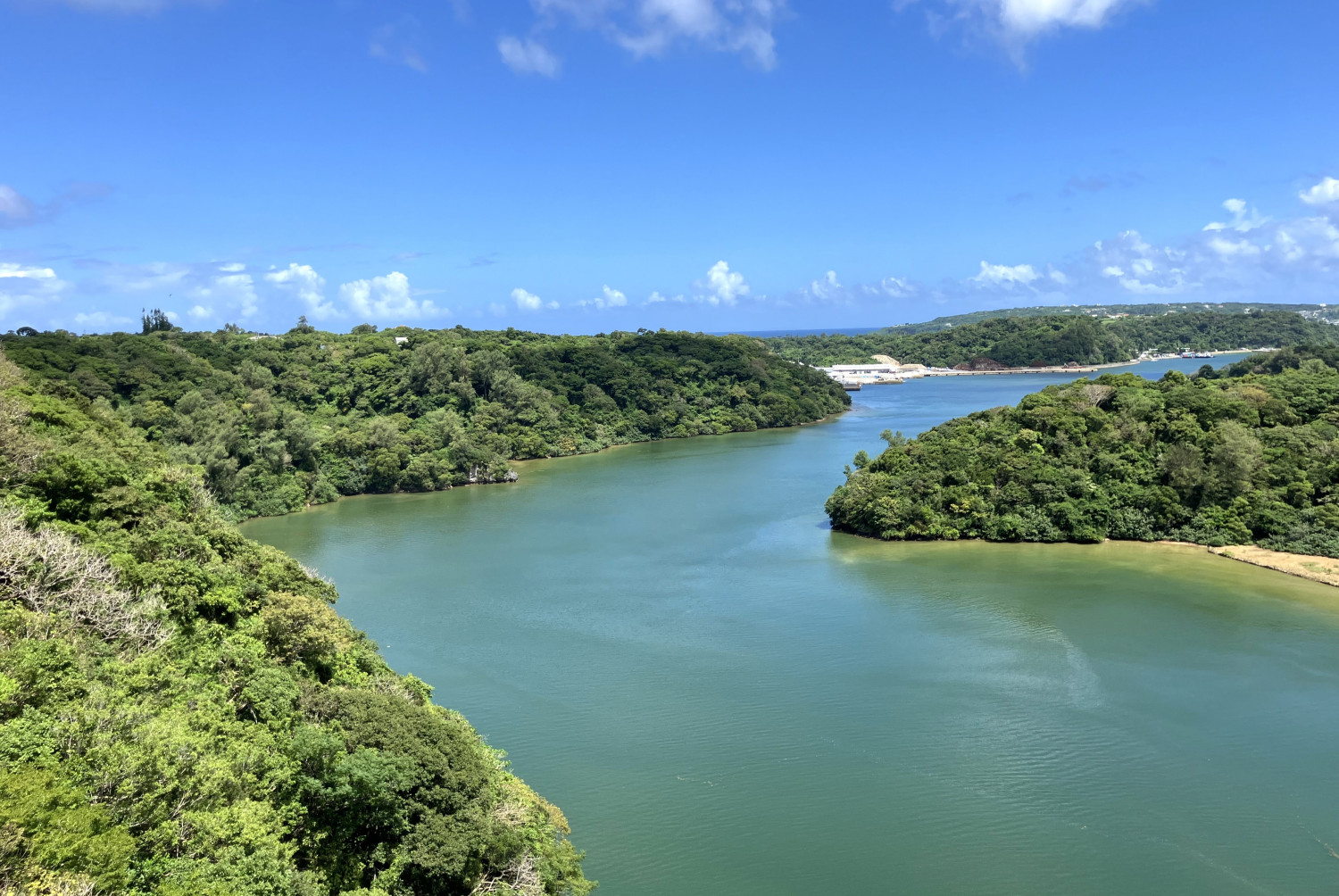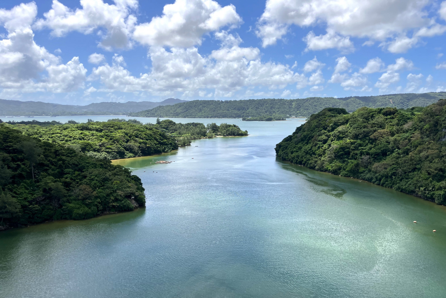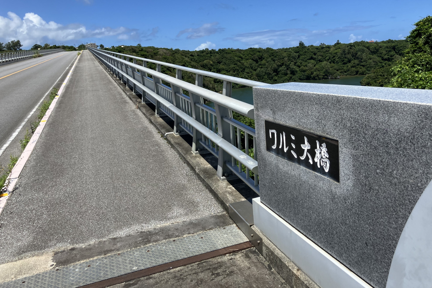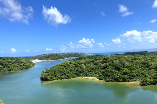 橋の下にはワルミ海峡が広がり、自然に包まれたヤンバルの景色が一望できます。
