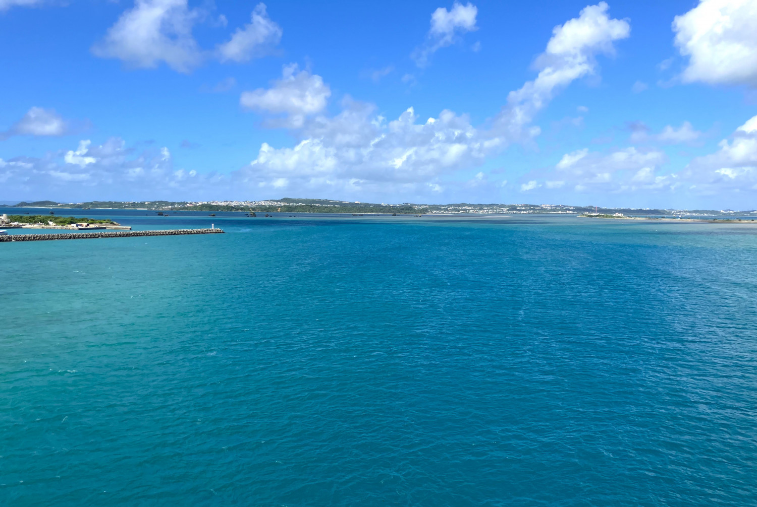 反対車線からは、泊港が一望。泊港は、渡嘉敷・座間味・粟国・渡名喜・久米島・南北大東の離島を結ぶ船舶が発着し、時間帯によっては全ての船を見ることができます。(📷③)