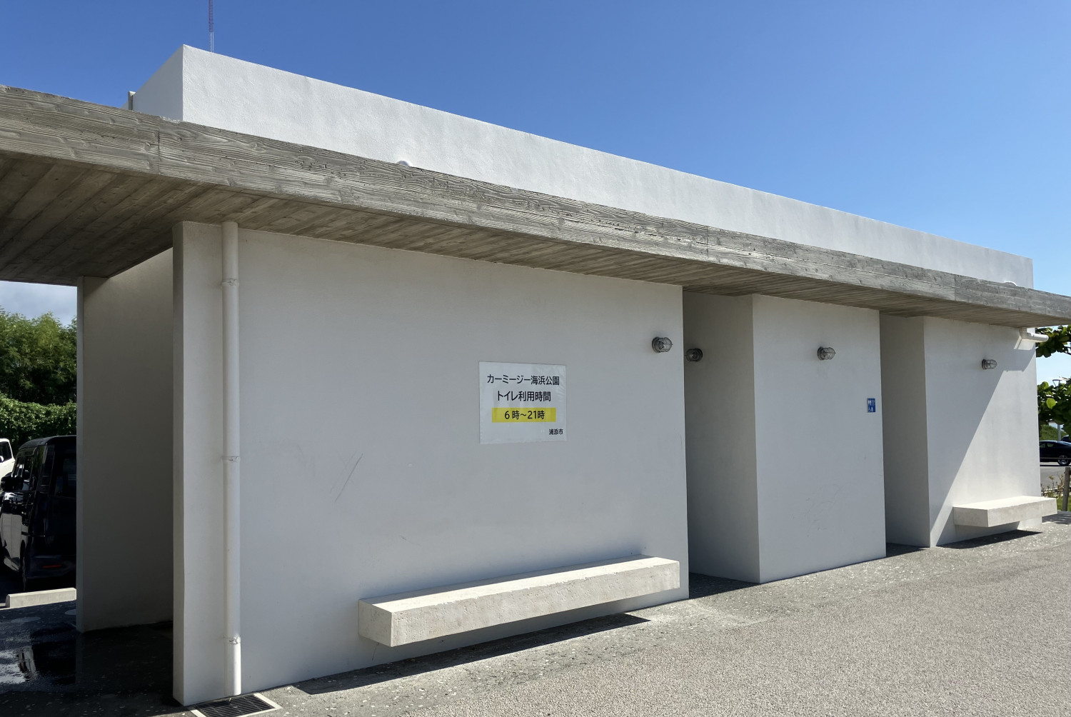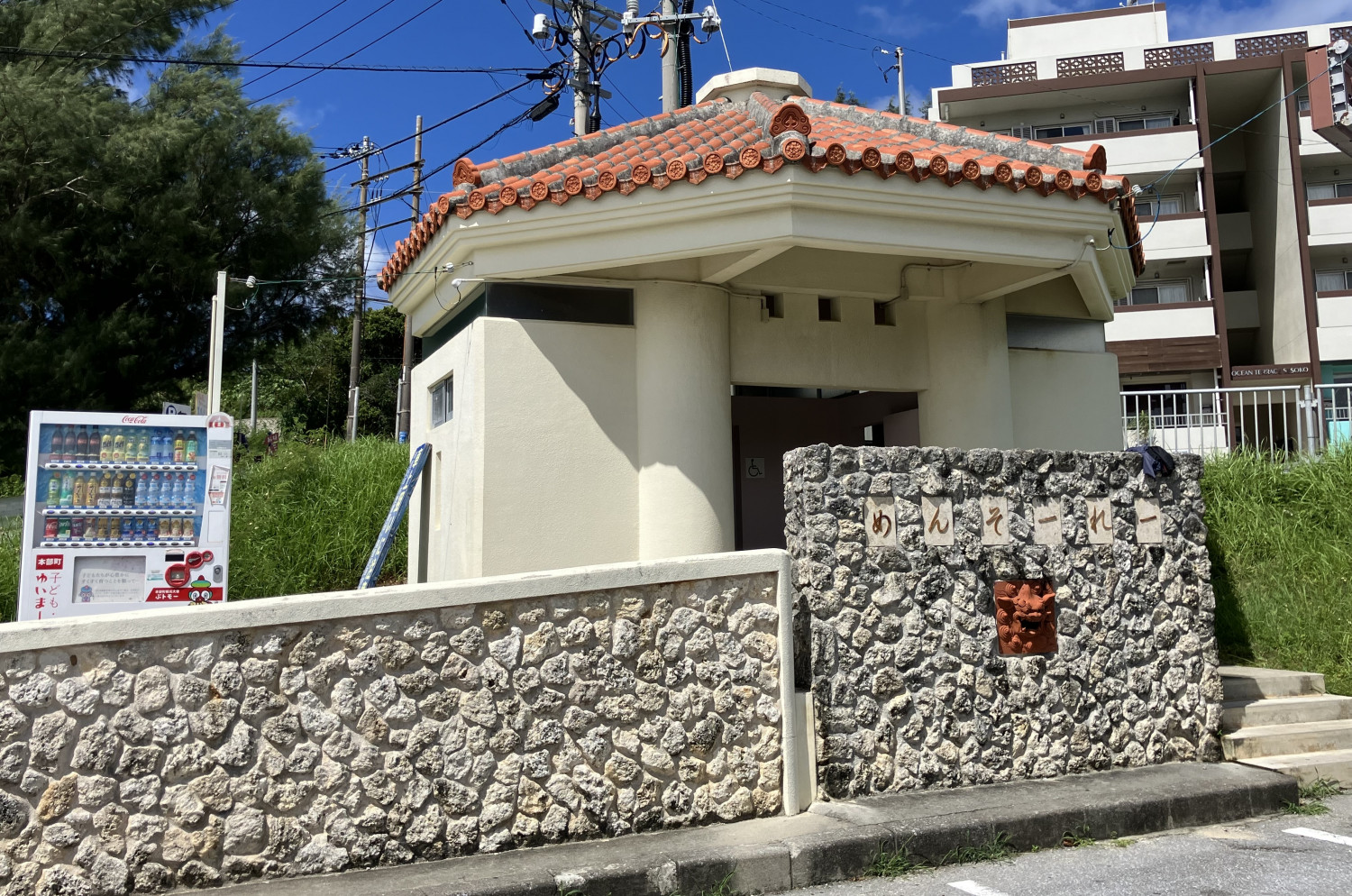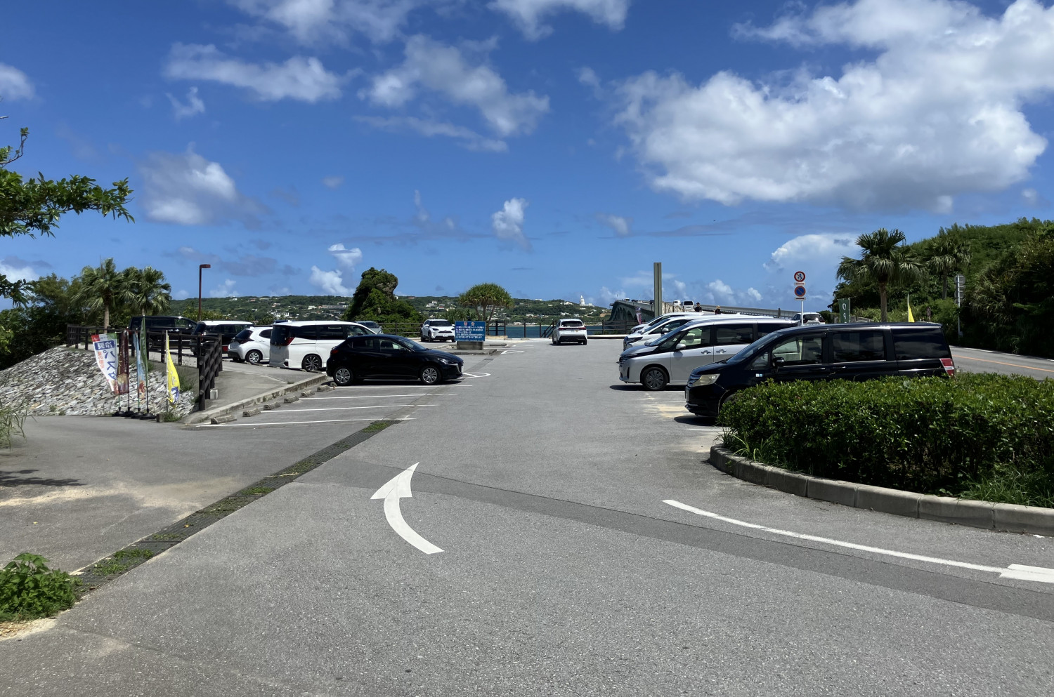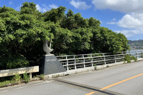 橋を渡って、瀬底島に入ったところに無料駐車場があります。トイレと自動販売機もあるので、ドライブ中の休憩場所としても最適です。開通記念碑もあります。
