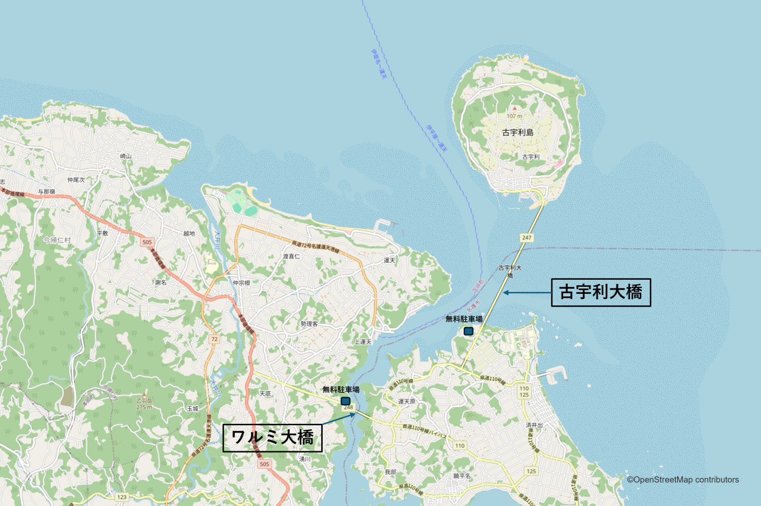 ワルミ大橋のたもとに無料駐車場があります。ここから歩いてワルミ大橋に行かれます。ワルミ大橋の手前には、「わるみこばし」があり、ここからは古宇利大橋を望むことができます。