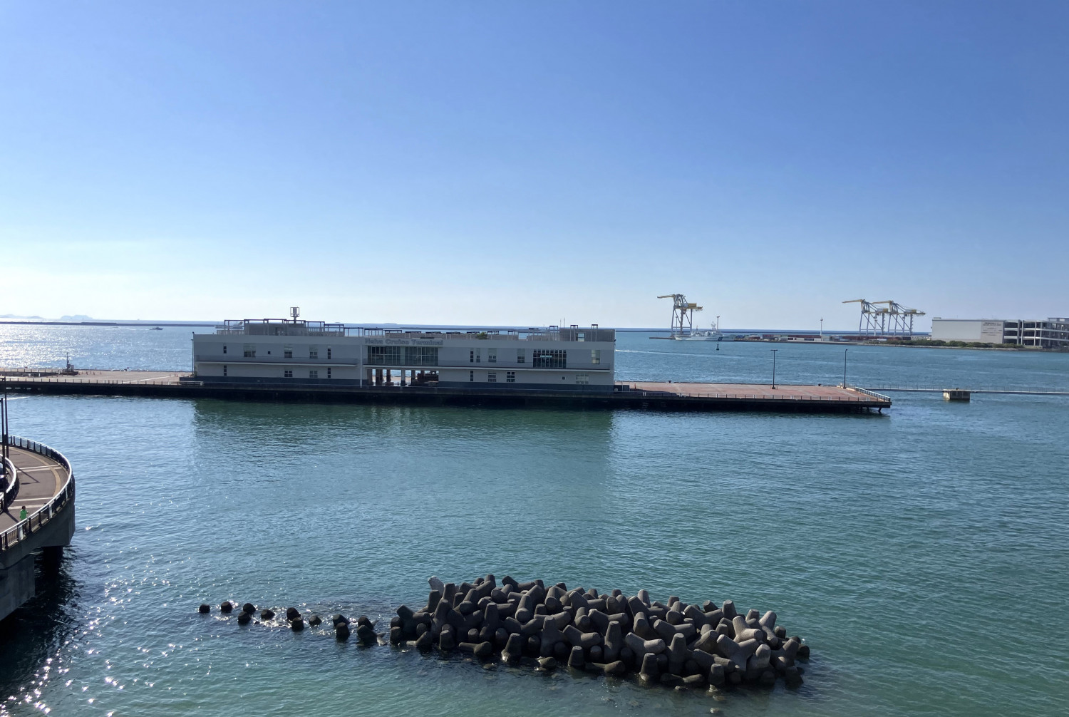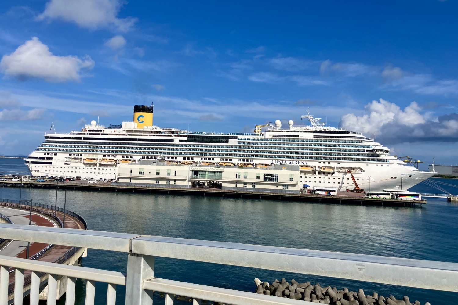 波の上橋から来た道を戻り、信号を超えてさらに進むと泊大橋です。海側には那覇クルーズターミナルがあり、運が良ければクルーズ船が見られます。その姿は圧巻です。(📷②)