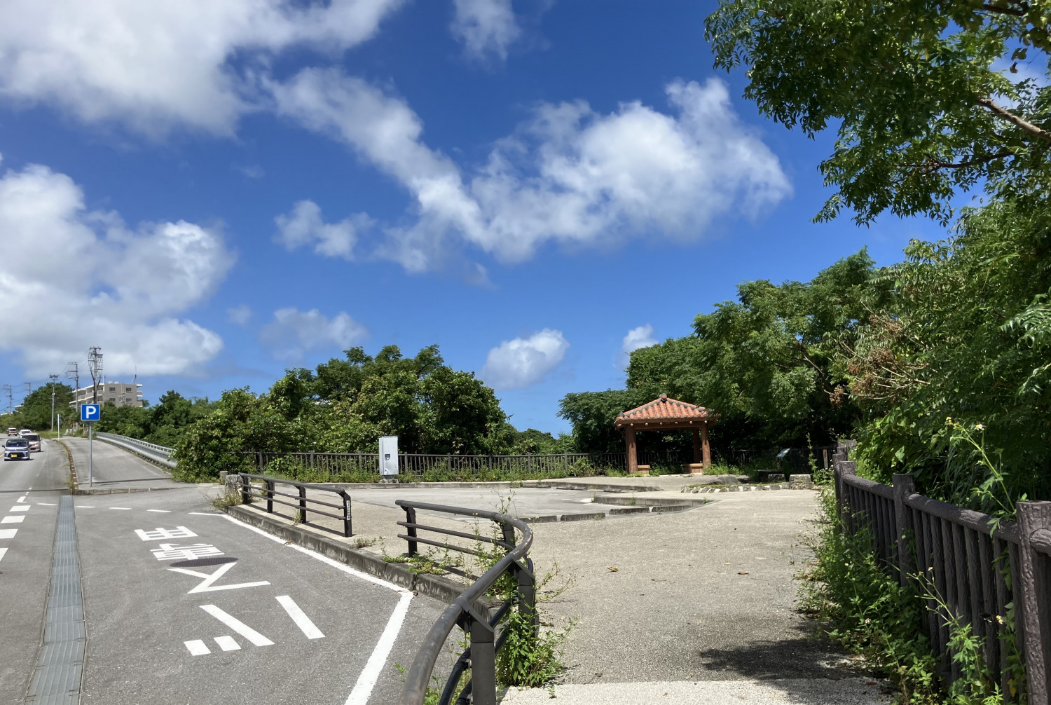 駐車場は、浦添北IC交差点にあり、無料でトイレや足洗い場もあります。ここに車を停めて歩くことができます。