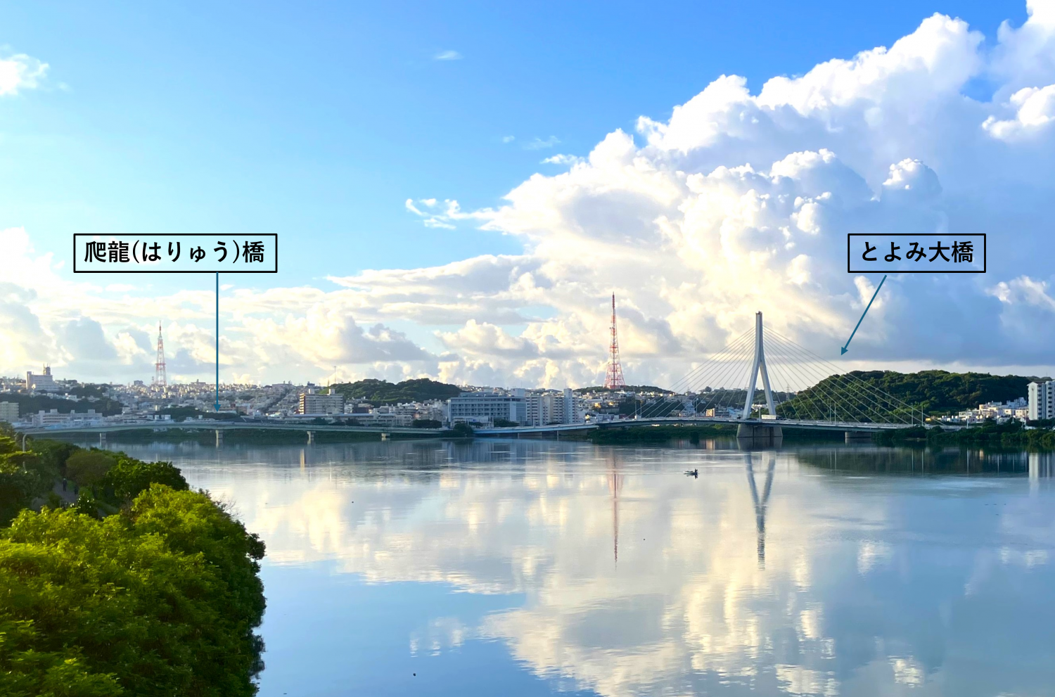 とよみ大橋を渡り、とよみ大橋(東)交差点を左に曲がると、国場川にかかる曲線の美しい爬龍(はりゅう)橋。下流側には那覇市の市街地が、上流側には豊見城市の市街地がひろがります。