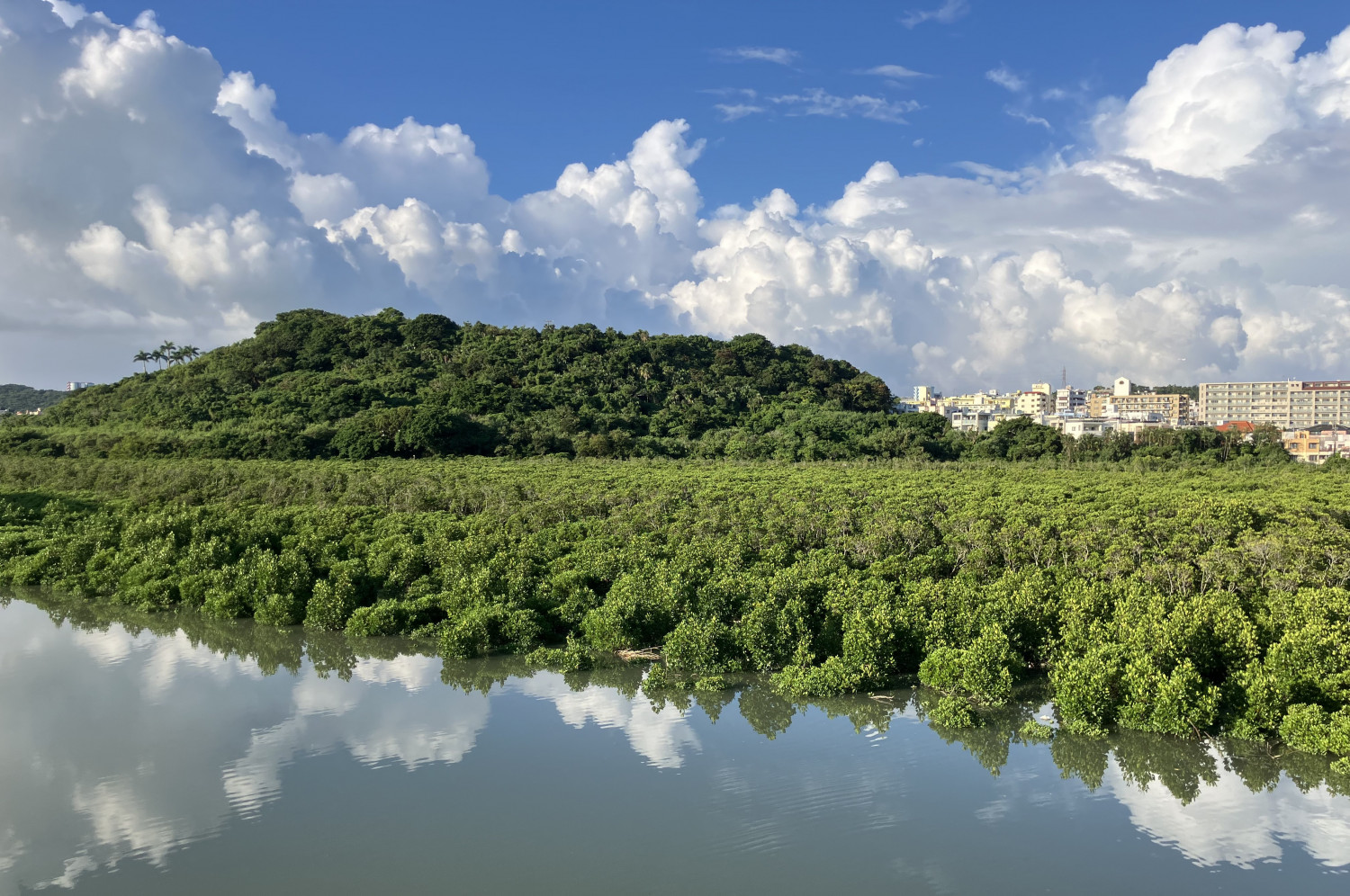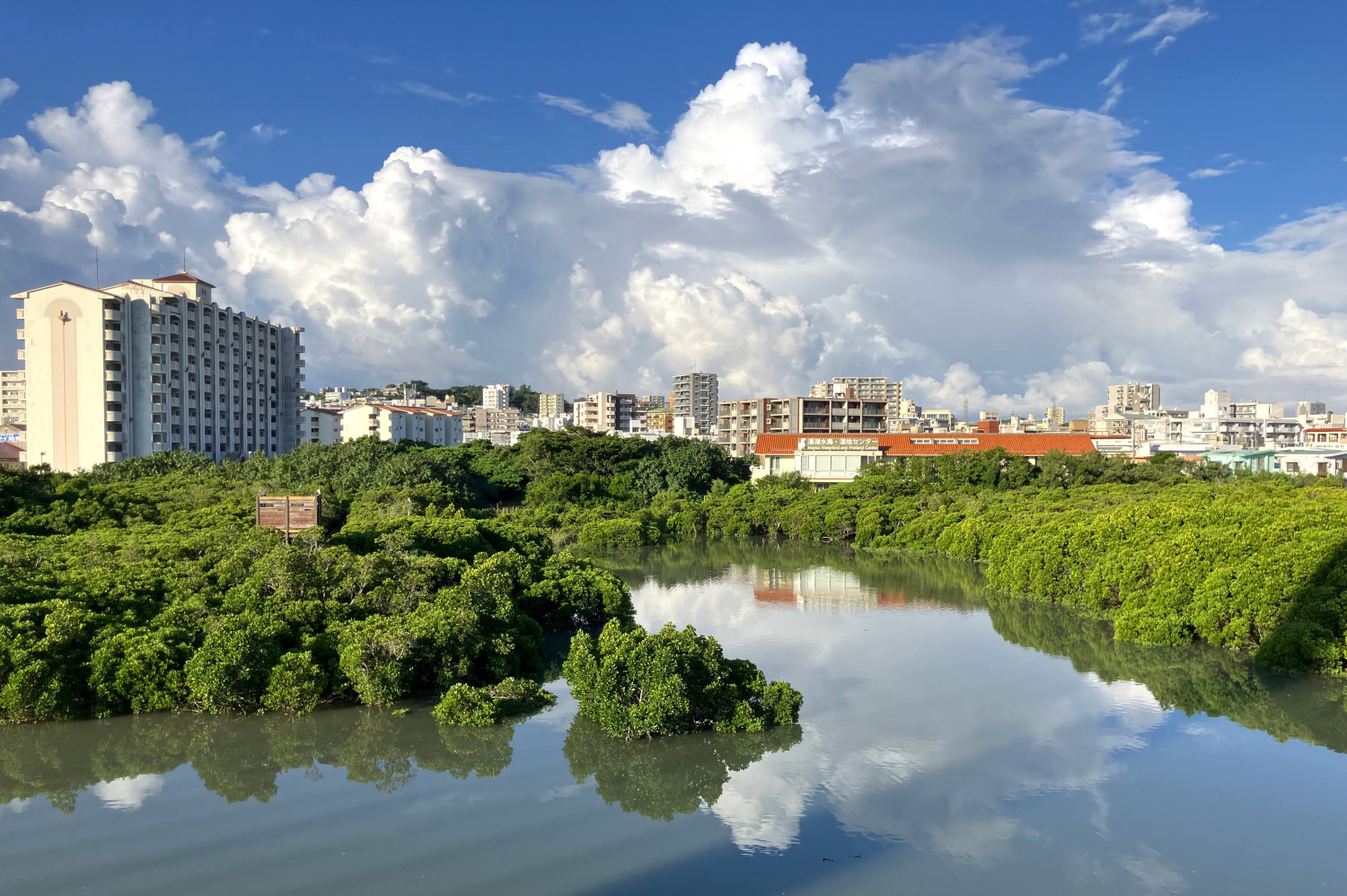 橋の下は国場川と饒波川の合流地点。ラムサール条約にも指定されている湿地帯で、マングローブの緑の絨毯が広がります。
