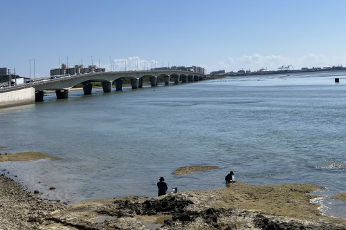 橋から見える海はとてもグラデーションが綺麗。遠浅なので、潮の満ち引きで風景が変わります。