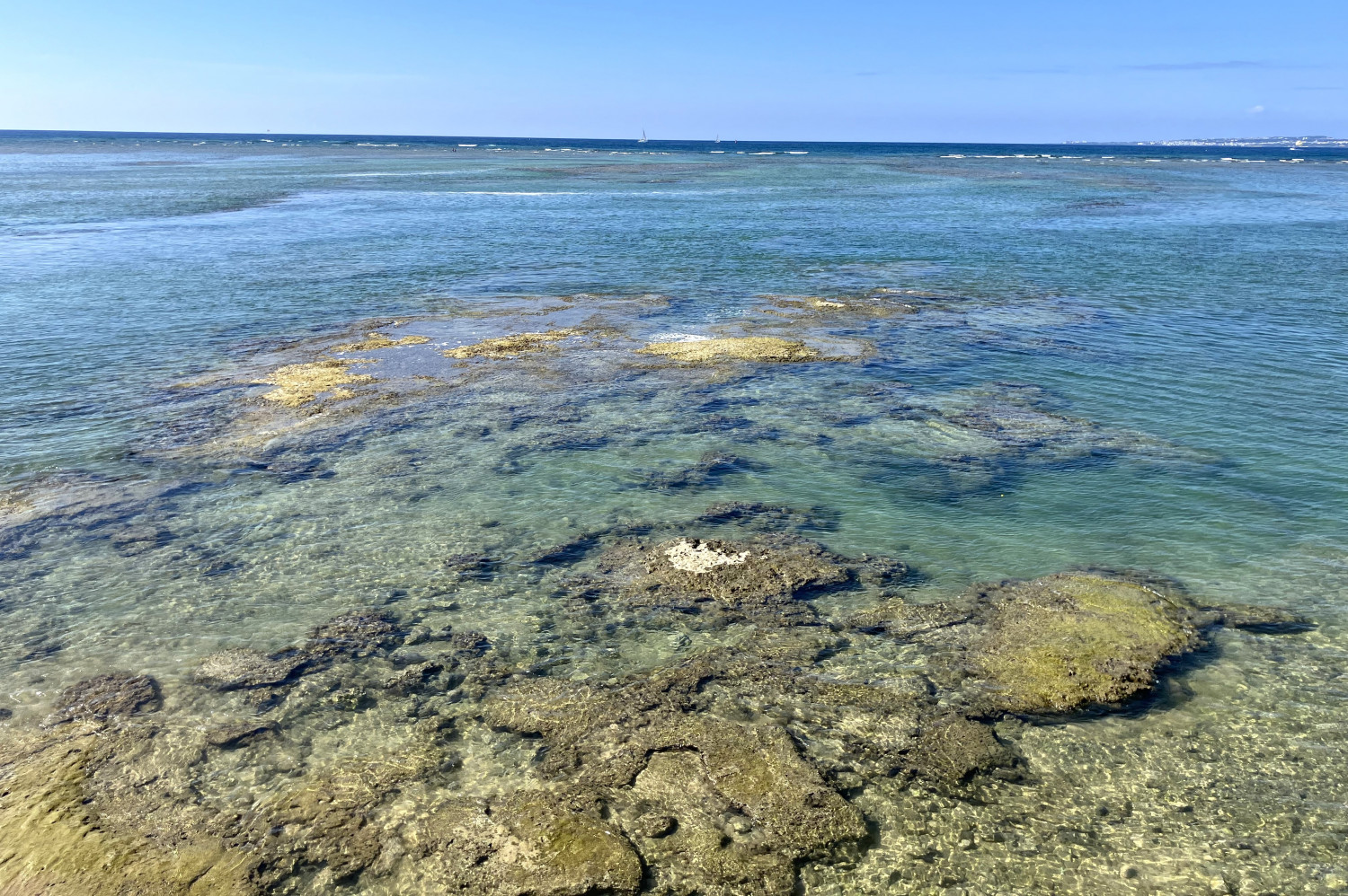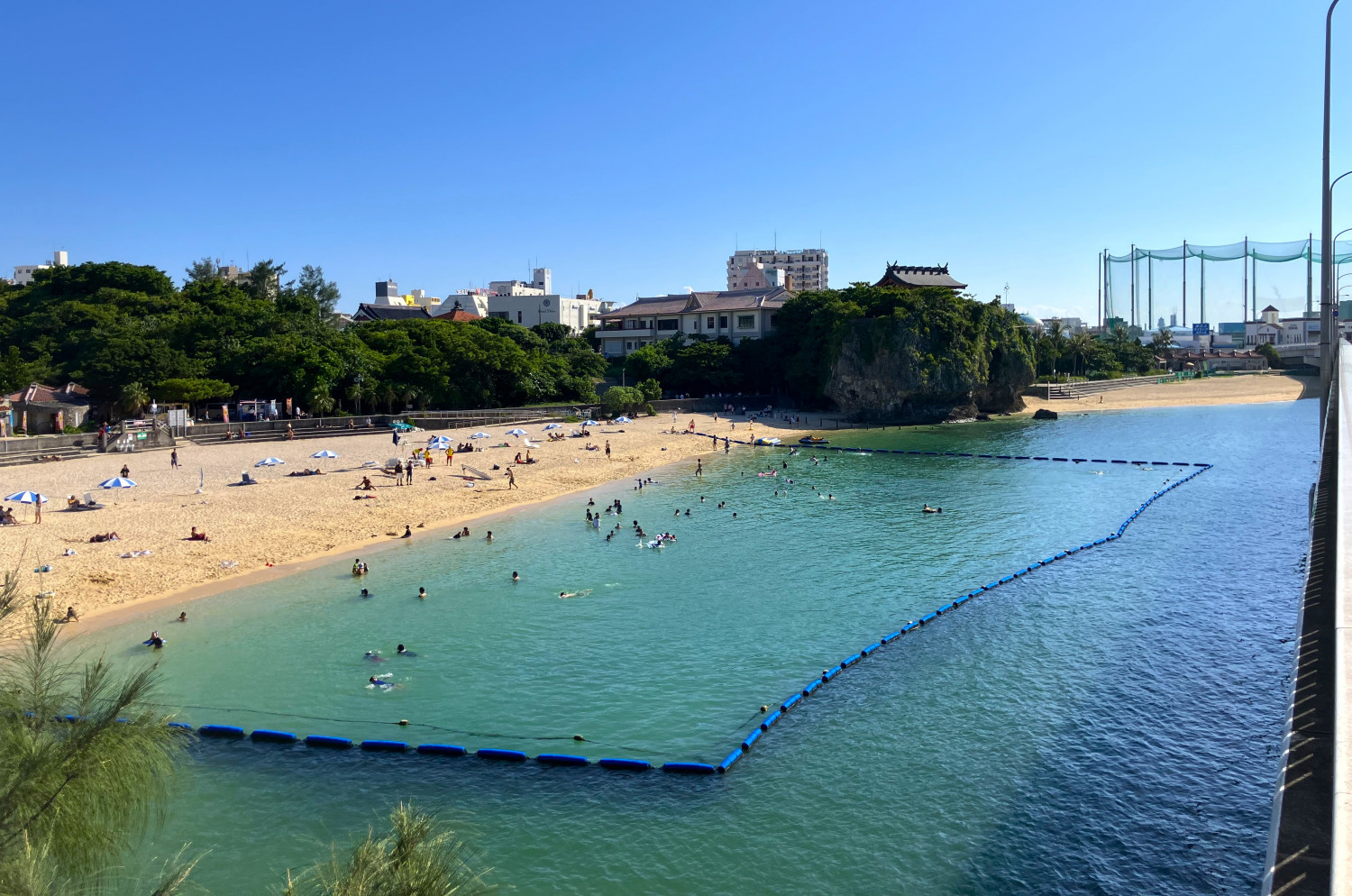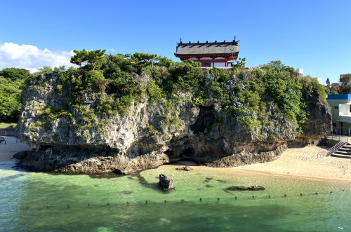 橋の上からはこのような景色。波の上ビーチや琉球石灰岩の巨石の上に建つ波上宮と、沖縄らしい風景が広がります。(📷①)